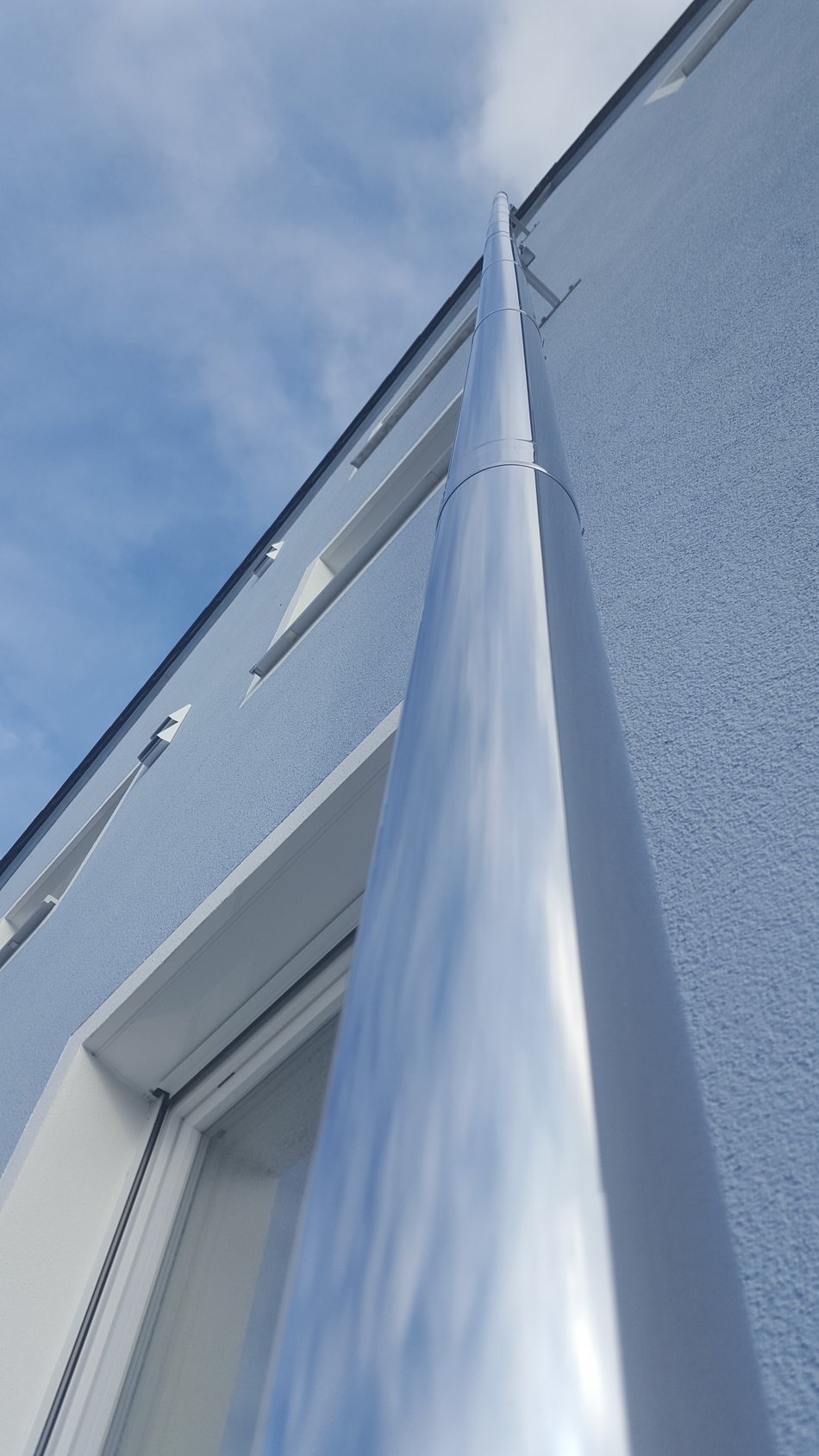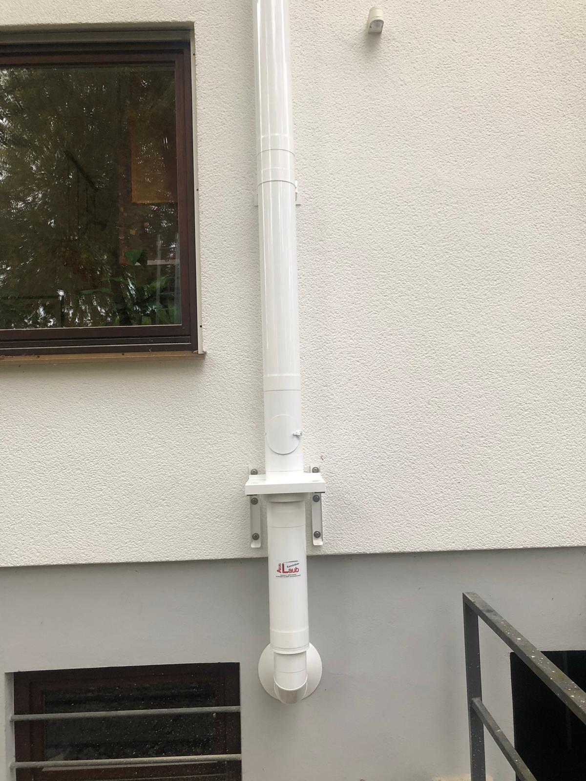Rengasmainen rako savukaasua kuljettavan muovisen sisäputken ja haponkestävästä teräksestä valmistetun ulkovaipan välillä tuo paloilman laitteelle.